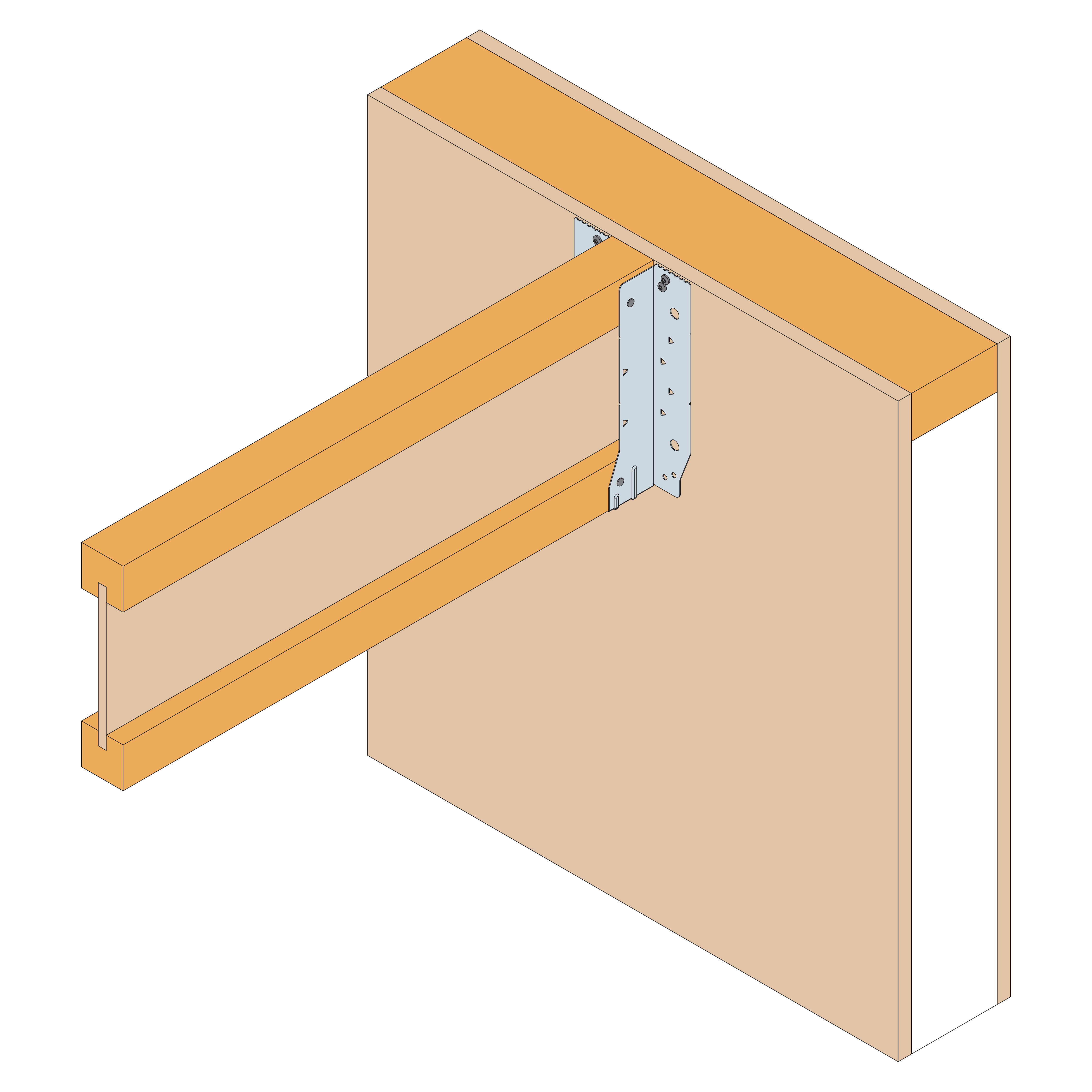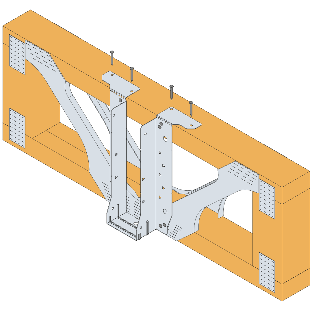 - Plaats de EWH-beugel op de voorkant van de dragende dwarsbalk en zorg ervoor dat de messing aan de basis strak tegen de onderkant van de onderste gording van deze dragende balk zit,