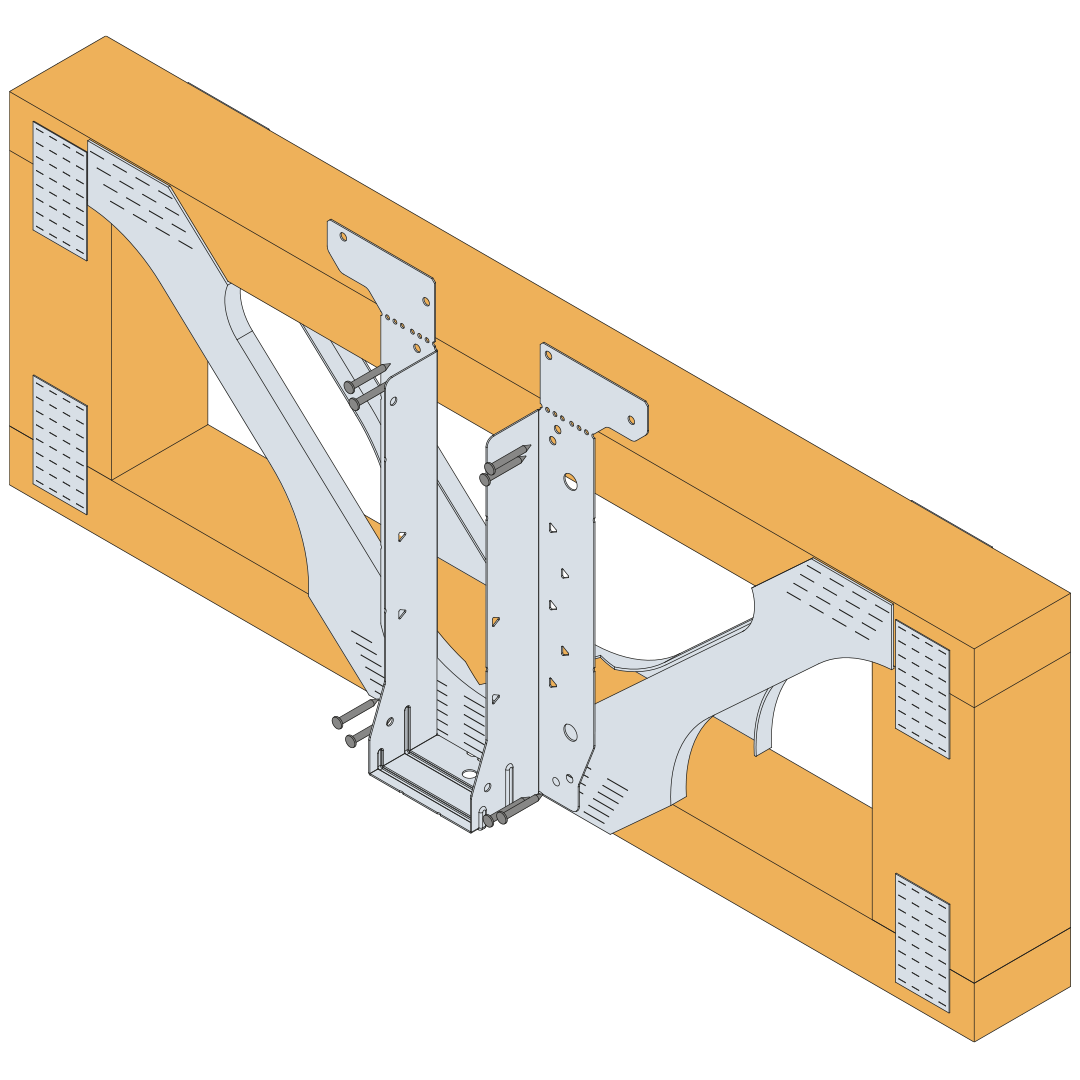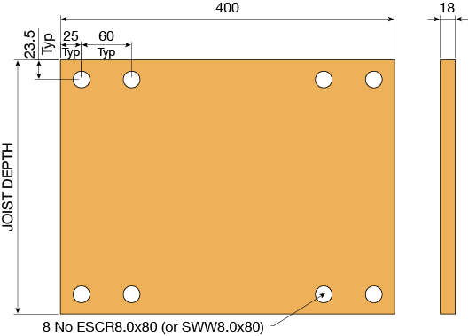 → Enhanced installation requires a 18mm plywood gusset to be fixed to the face of the metal web joist. The plywood gusset is to be at least 400mm long and full depth of the metal web joist. The plywood gusset is installed with 8 No ESCR8.0x80mm screws. The screws are to be positioned in accordance to illustration within the Installation Notes section.