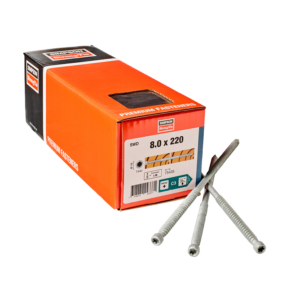SWD is een constructieschroef ontworpen om twee houten bouwdelen aan elkaar te verbinden. De kleine dopvormige kop en dubbele schroefdraad zorgen voor een flexibele, verborgen verbinding met een hoge sterkte. De gedifferentieerde schroefdraadspoed zorgt voor een klemeffect, waardoor het risico op spleten tussen de houten delen wordt verkleind.