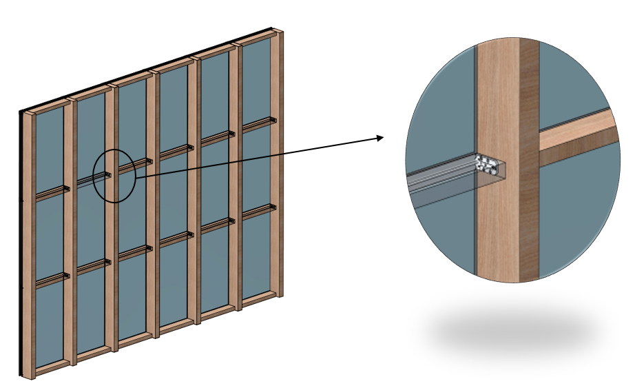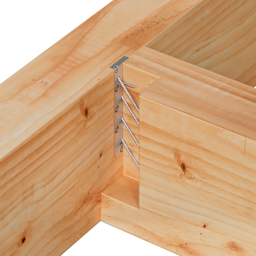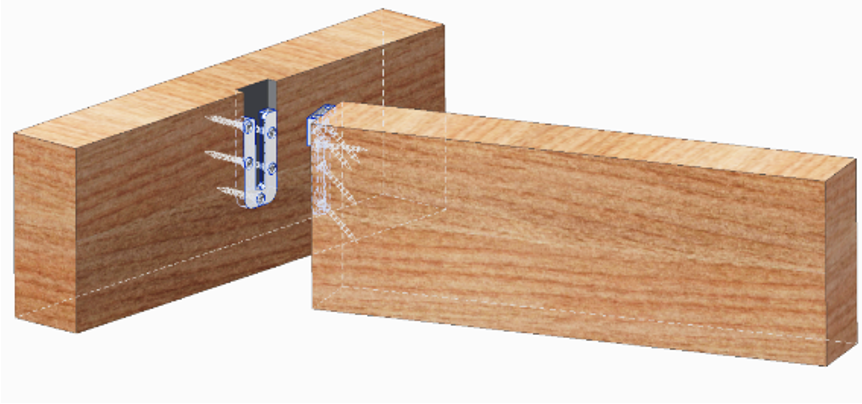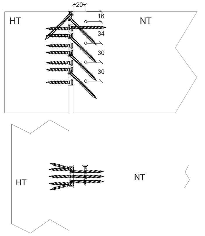 - On joist, TTUFS Ø4mm (full thread) according to ETA-21/0670: The TTUFS screws are inserted 45° to the connector. Except one TTUFS in the middle of the joist (male part), which is inserted into the joist perpendicular to the connector, this one is also used as an installation help.