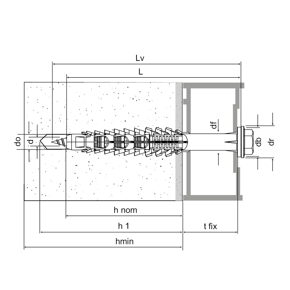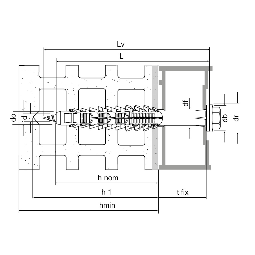 | Ø drilling hole [d0] [mm] | Min. drill depth [h1] [mm] | Ø drilling fixture [df] [mm] | |
