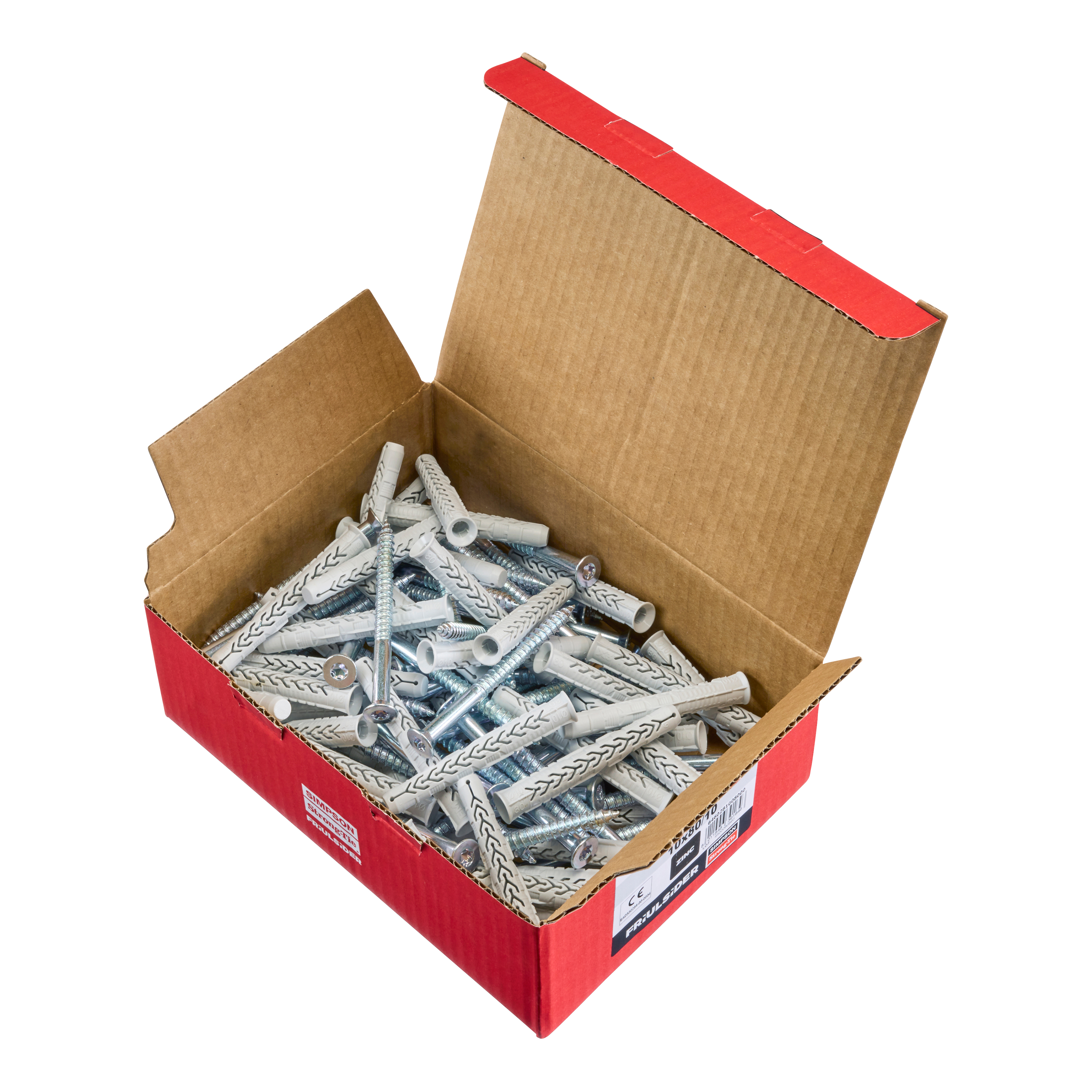 | Referentie | Product Reference | Plug [ØxL] [mm] | Screw [ØxL] [mm] | Reduced fixture thickness [tfix] [mm] | Standard fixture thickness [tfix] [mm] | Increased(1) fixture thickness [tfix] [mm] | Bit | Wrench | Built-in washer [Ø] | Qty per box | Qty per outer box |