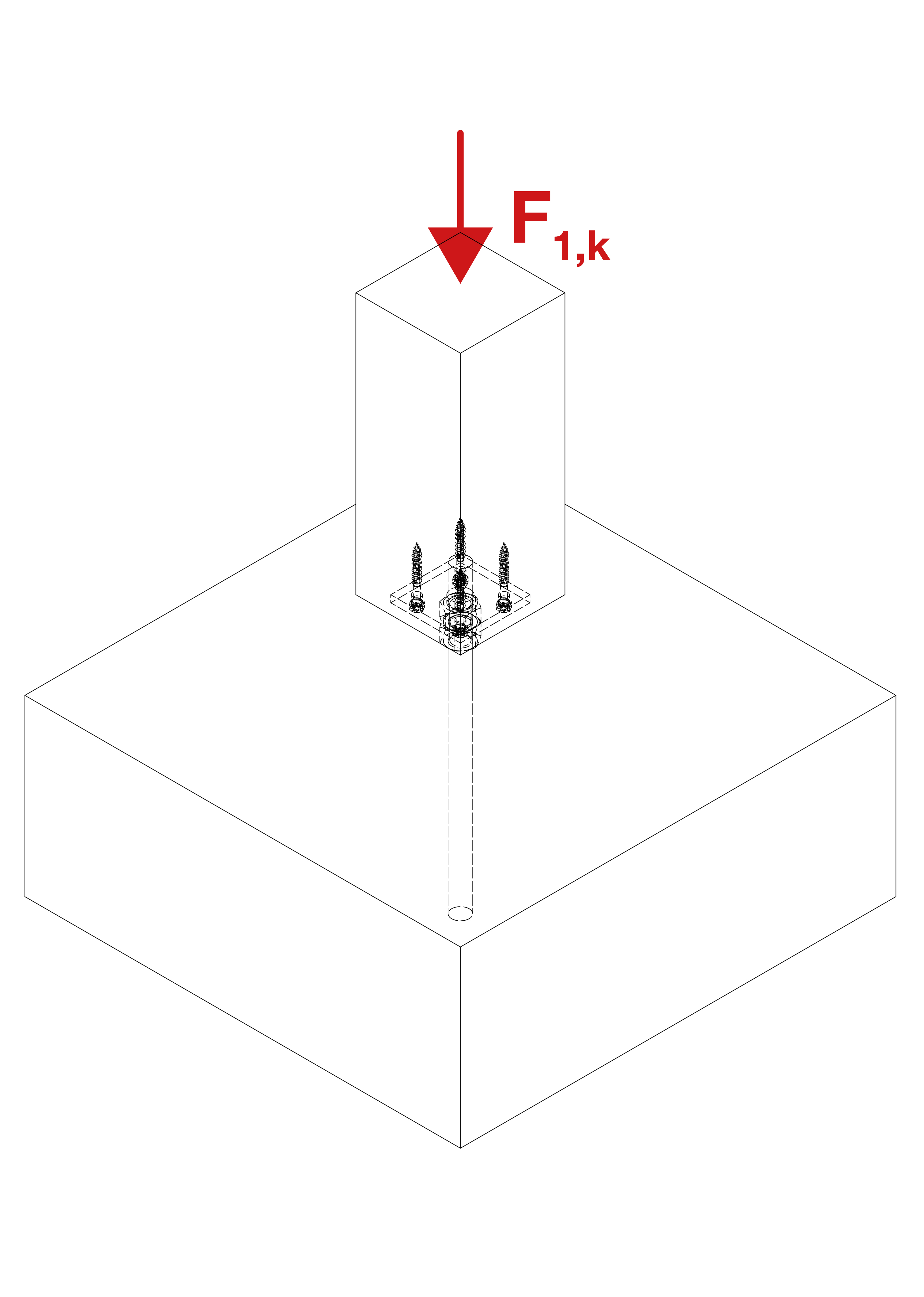 De kolomvoet PISBMAX biedt een hoge belastingsterkte op druk en moet vastgebout worden op een harde ondergrond van het type beton. Hij wordt aangeboden in kitvorm met vier doorsteekankers FM-753 CRACK 3DG M16-150/30.
