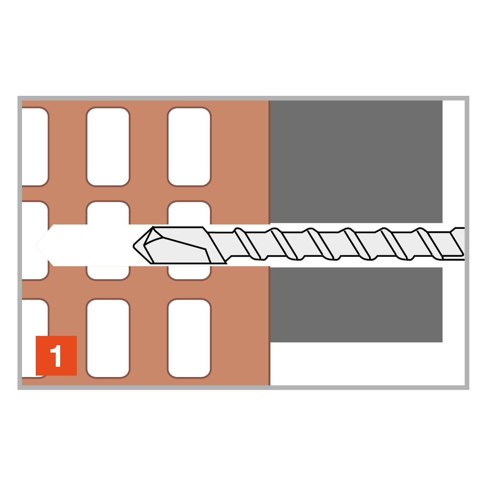 Referentie Product Reference Hole diameter x anchor length [doxL] [mm] Fixture thickness [tfix] [mm] Min. hole depth [h1] [mm] Nominal embedment depth [hnom] [mm] Min. support thickness [hmin] [mm] Hole diameter in fixture [df] [mm] Screw diameter [d] [mm] Screw length [Lv] [mm] Wrench Qty per box  Qty per outer box [mm]