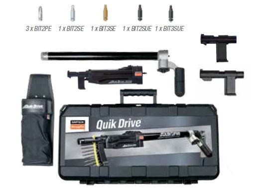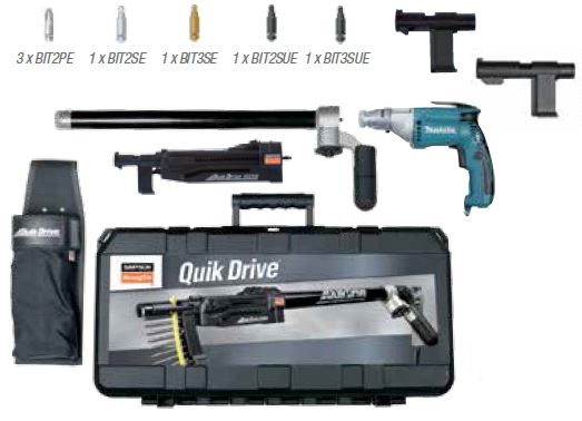 QD76KE: uitbreidingskit omvat het gereedschap QD76, 1 verlengsnoer, 1 neus uit composietmateriaal voor schroeven van 25 tot 51 mm, 1 stalen neus voor schroeven van 38 tot 64 mm, 1 stalen neus voor schroeven van 76 mm, de koffer en de meegeleverde schroefbits (3 BIT2PE + 1 BIT2SE + 1 BIT3SE + 1 BIT2SUE + 1 BIT3SUE),