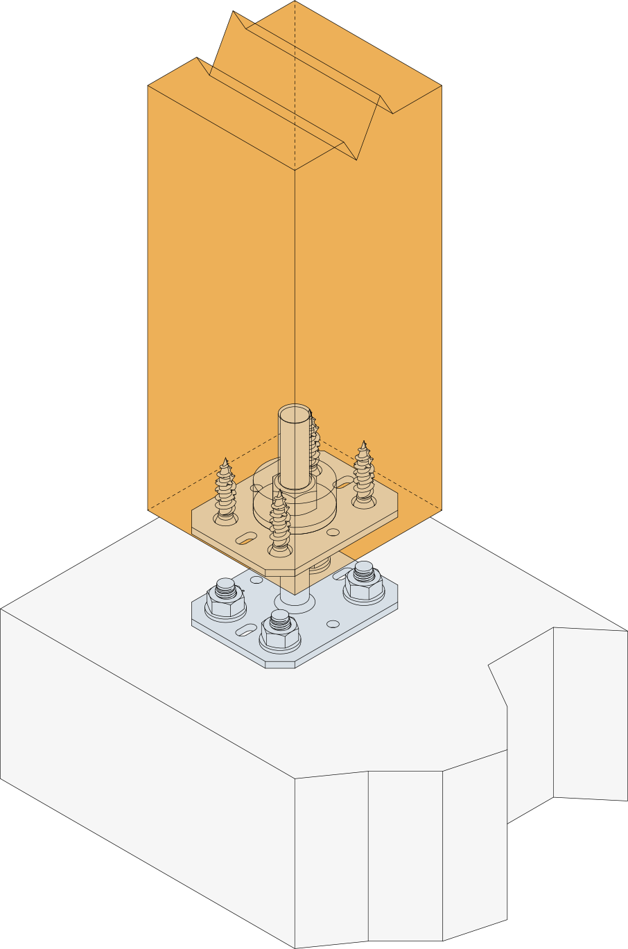 - Bevestig dit plaatje aan de kolom met behulp van houtdraadbouten LAG of SSH Ø8x40 (voorboren noodzakelijk).