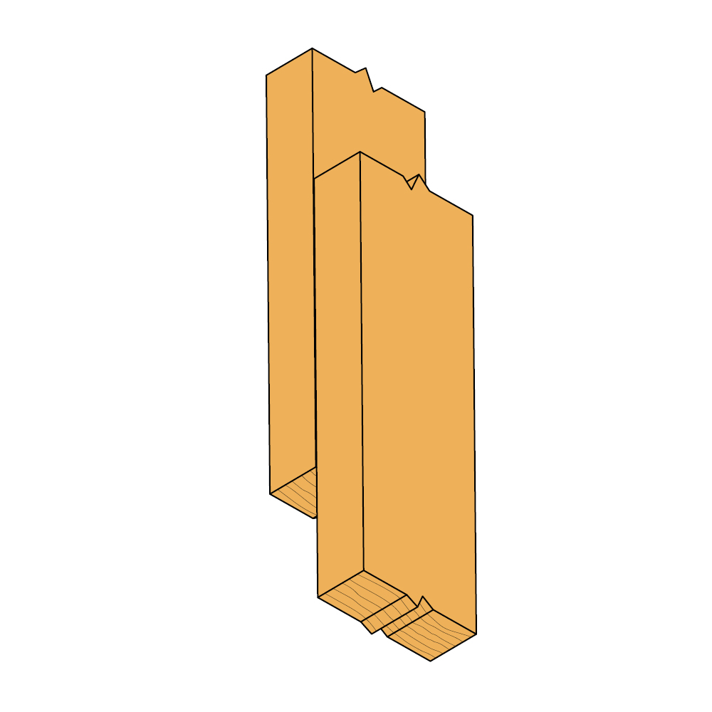 - De twee delen van de ICST staan tegenover elkaar in de eindpositie. Beide houten elementen kunnen eenvoudig aan elkaar verbonden worden via een geleidingsklauw op het spie-eind.