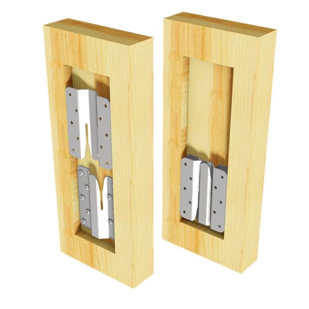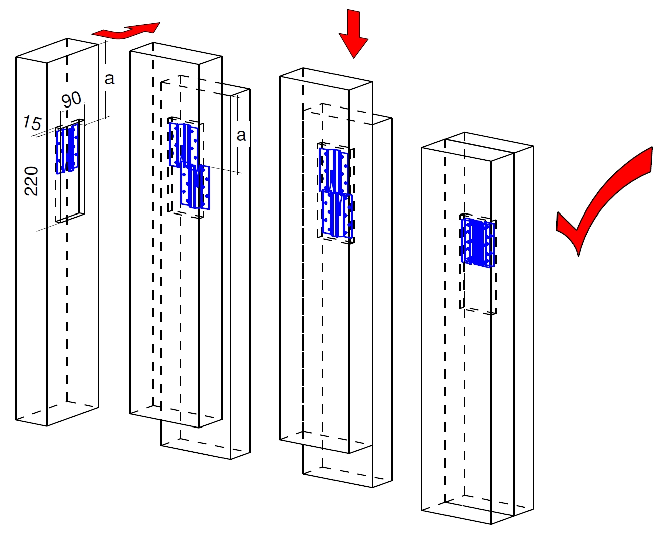 - De ICST wordt paarsgewijs gebruikt. Voor de montage ervan moet slechts een vlakke inkeping worden gemaakt in een stijl naar keuze van de gebruiker. Die vlakke inkeping moet 15 mm diep zijn, 90 mm breed en minimaal 220 mm lang. De minimumafstand van de ICST tot de uiteinden van de stijlen bedraagt 100 mm.