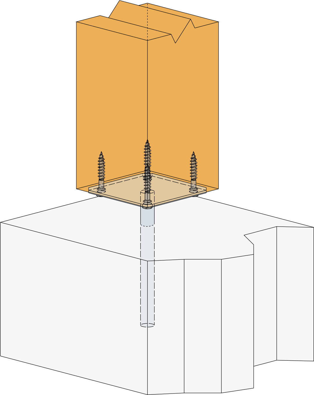 - Bevestig dit plaatje aan de kolom met behulp van houtdraadbouten LAG (voorboren noodzakelijk).