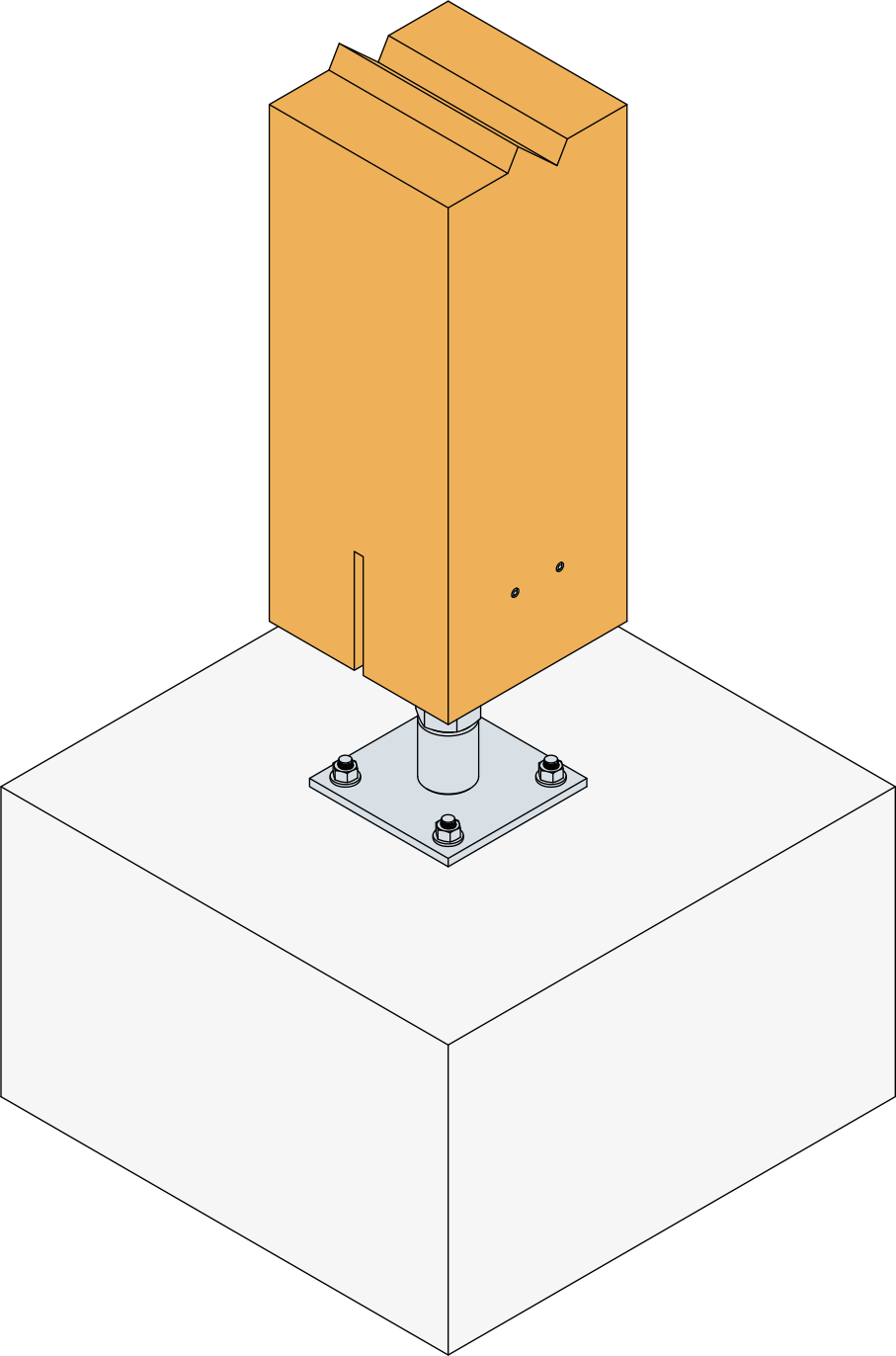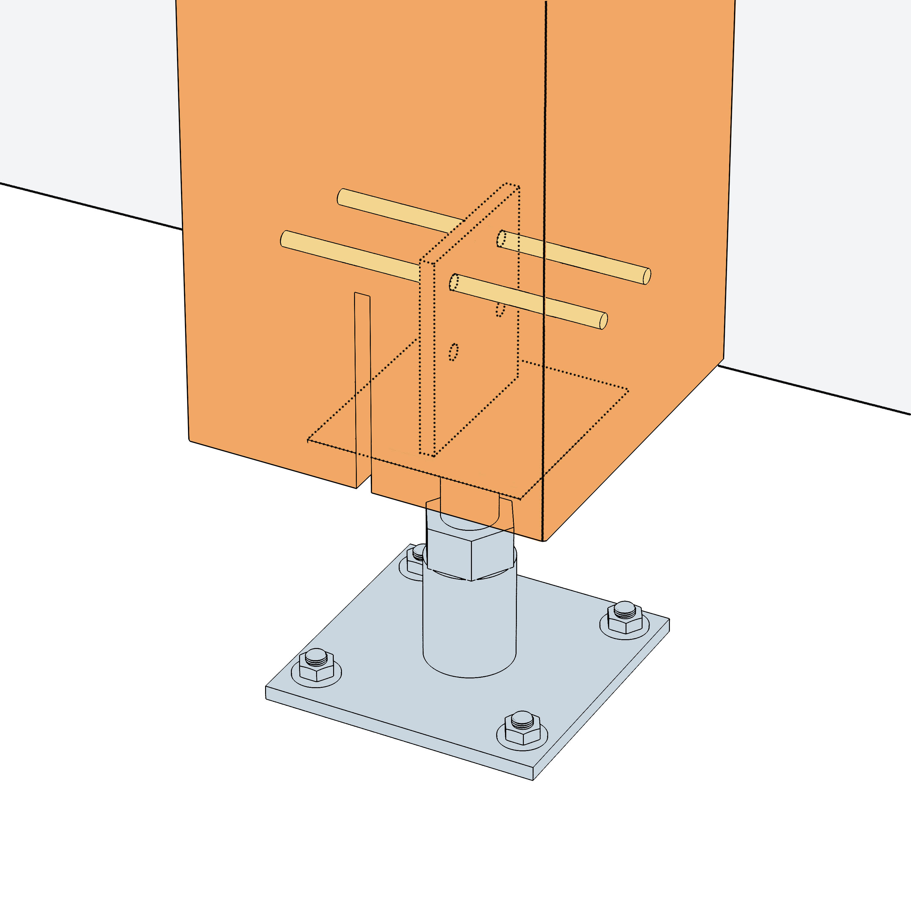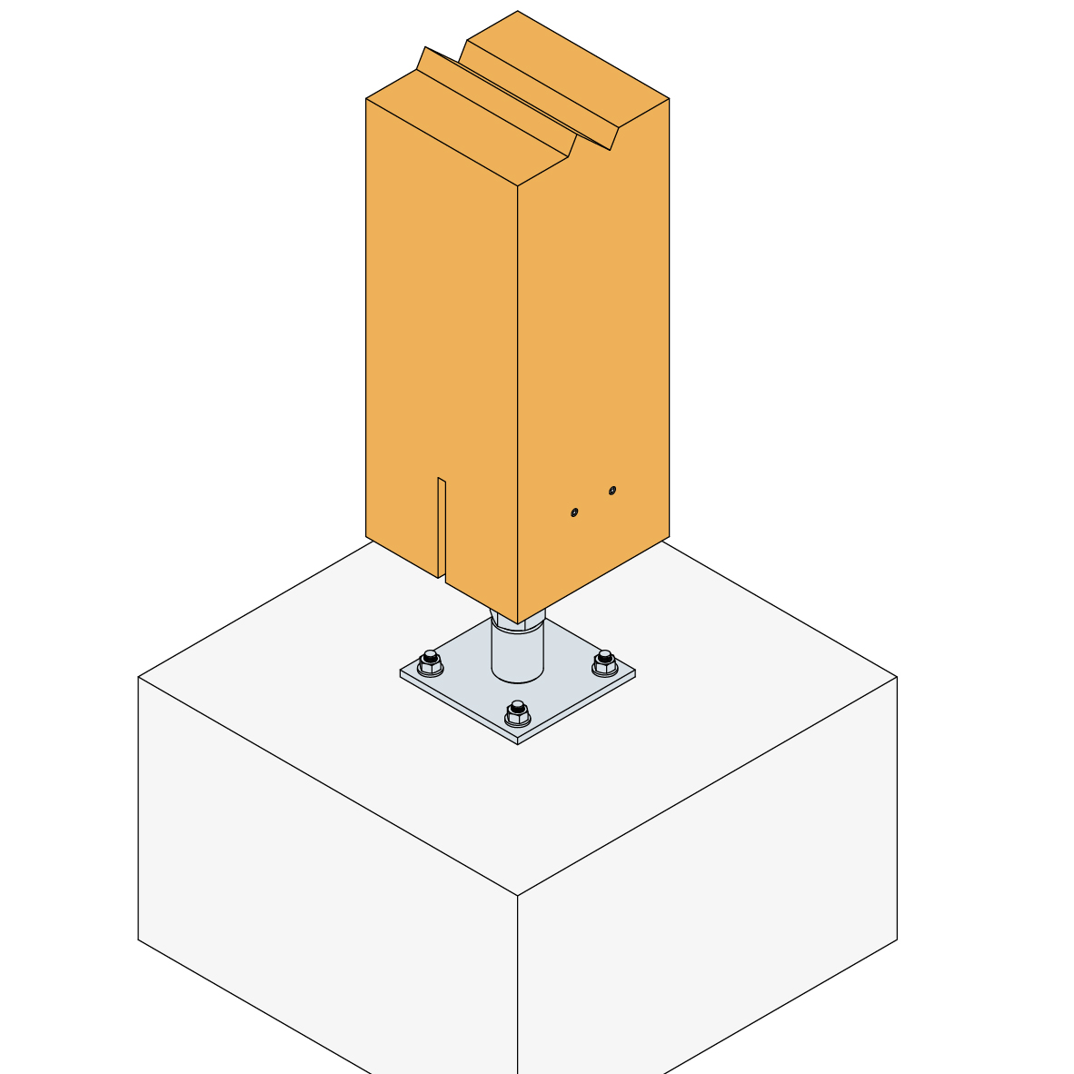 De kolomvoet wordt met de houten kolom verbonden door middel van de twee bovenste pennen.
