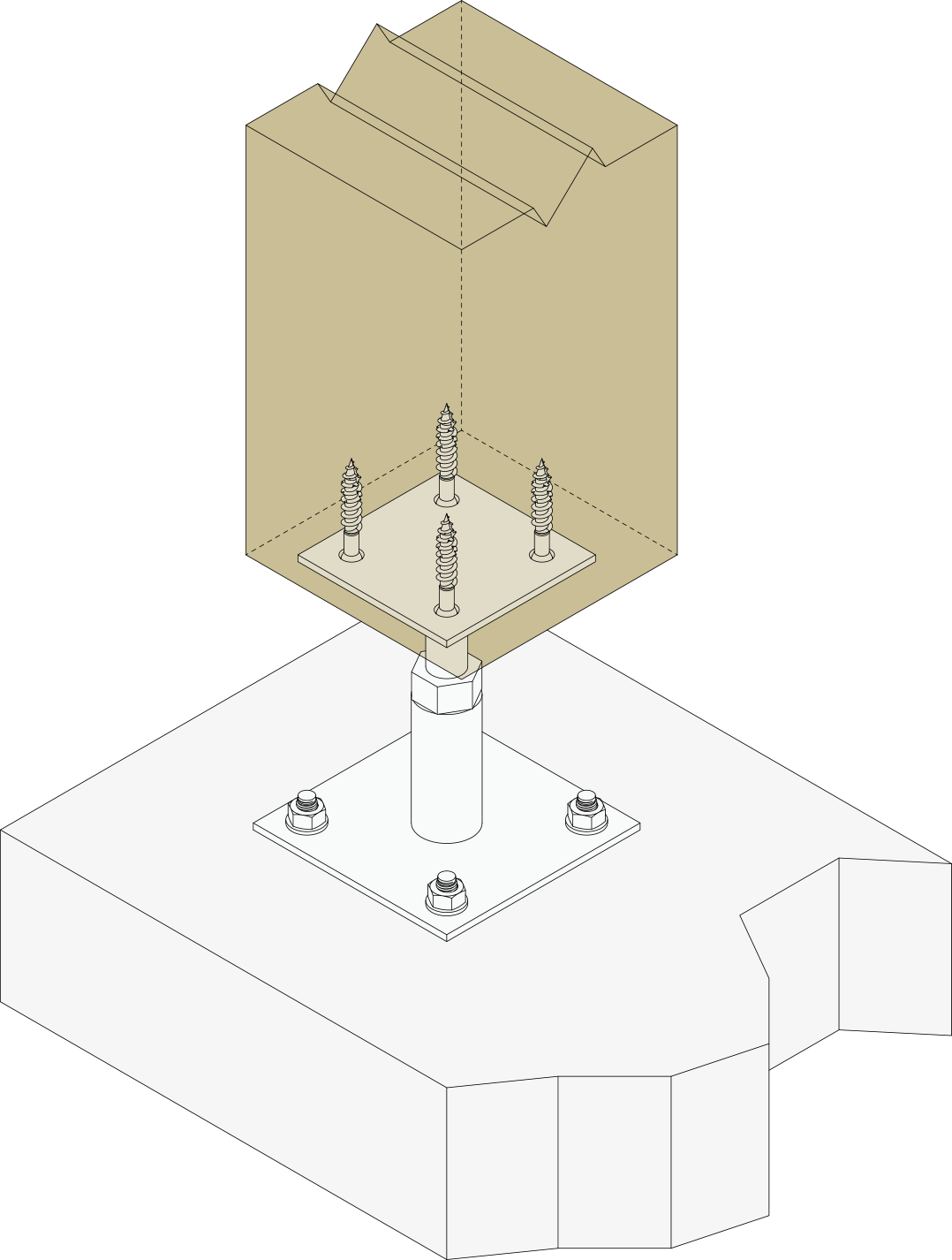 - Bevestig dit plaatje aan de kolom met behulp van houtdraadbouten LAG (voorboren noodzakelijk).