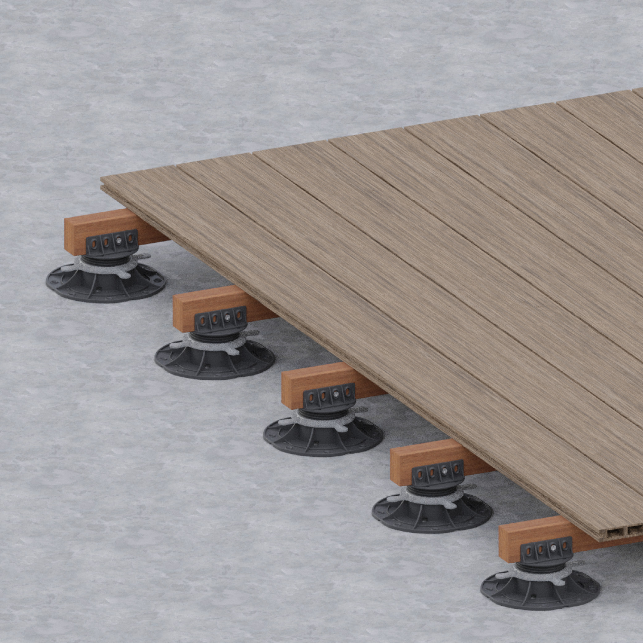 Zodra de terrasbalken/-tegels zijn gelegd, kan de hoogte van de dragers nauwkeurig worden versteld met een moer/schroef.