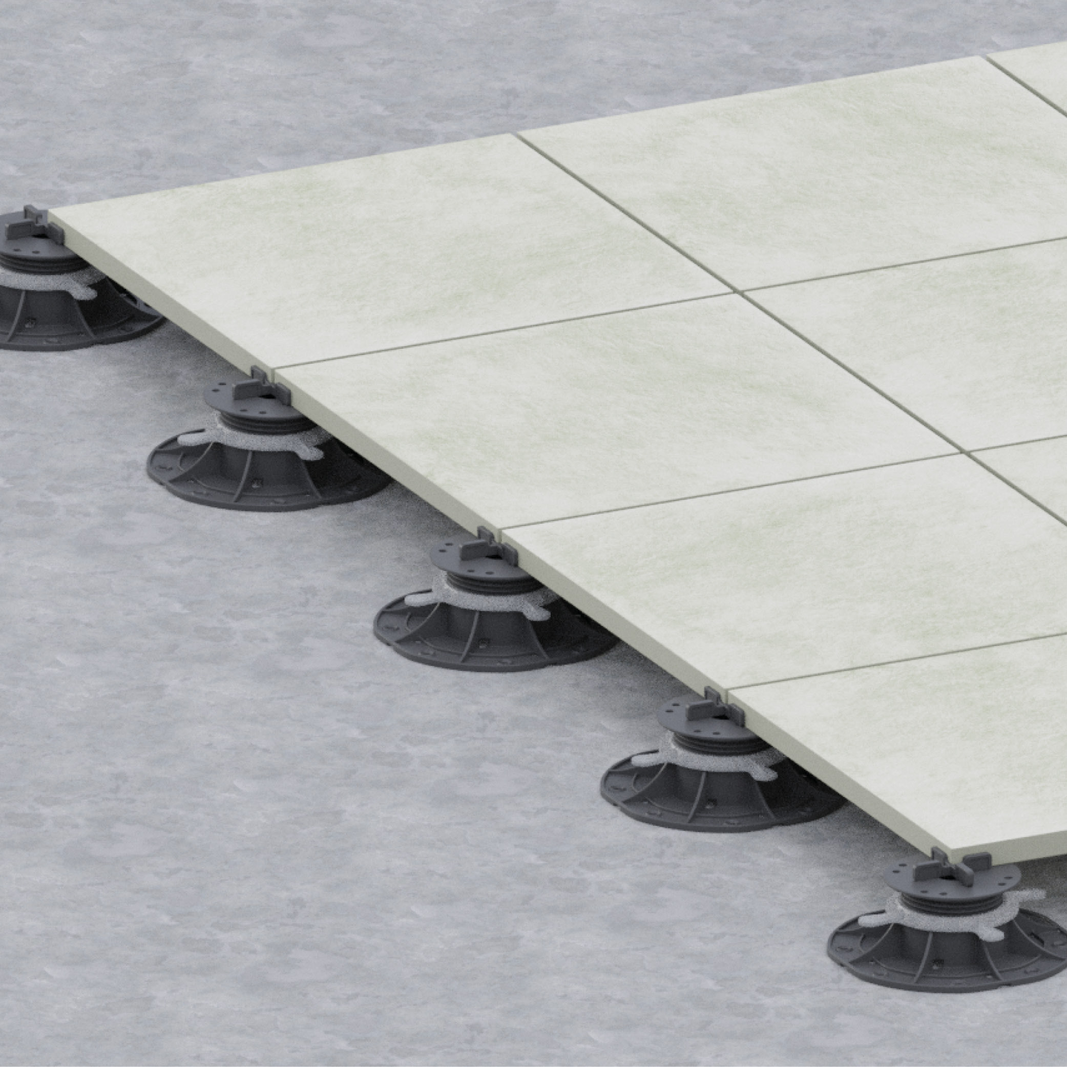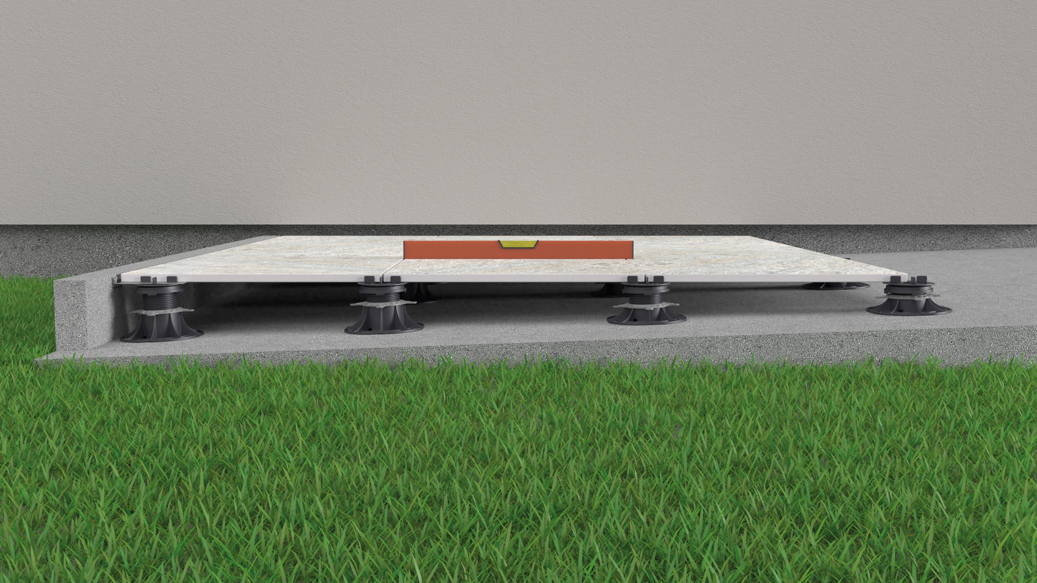 In het geval van een terrastegel zorgen afstandsblokjes op de bovenkant van de drager ervoor dat de tegel correct wordt geplaatst en op zijn plaats wordt gehouden.